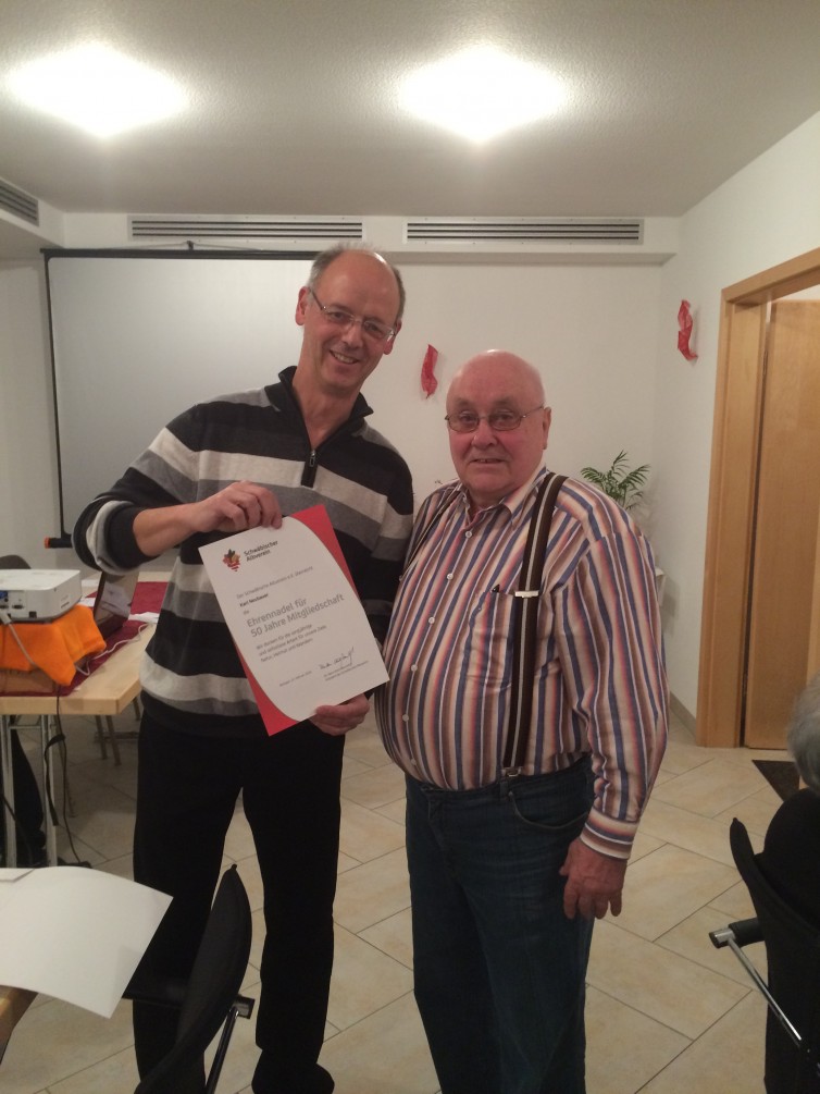 Wir möchten auch eine Ehrung für 50-jährige Mitgliedschaft im Schwäbischen Albverein unerwähnt lassen. Geehrt wurde Karl Neubauer.